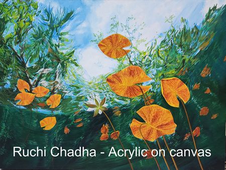 Visitors to the opening explored works that move between figuration and symbolic abstraction. Bharti Verma’s paintings reflect an inward gaze, where the human form becomes a site of memory, emotion, and introspection. In contrast, Ruchi Chadha’s lotus-inspired compositions evoke themes of renewal and quiet strength, using the flower as a metaphor for growth and emergence.